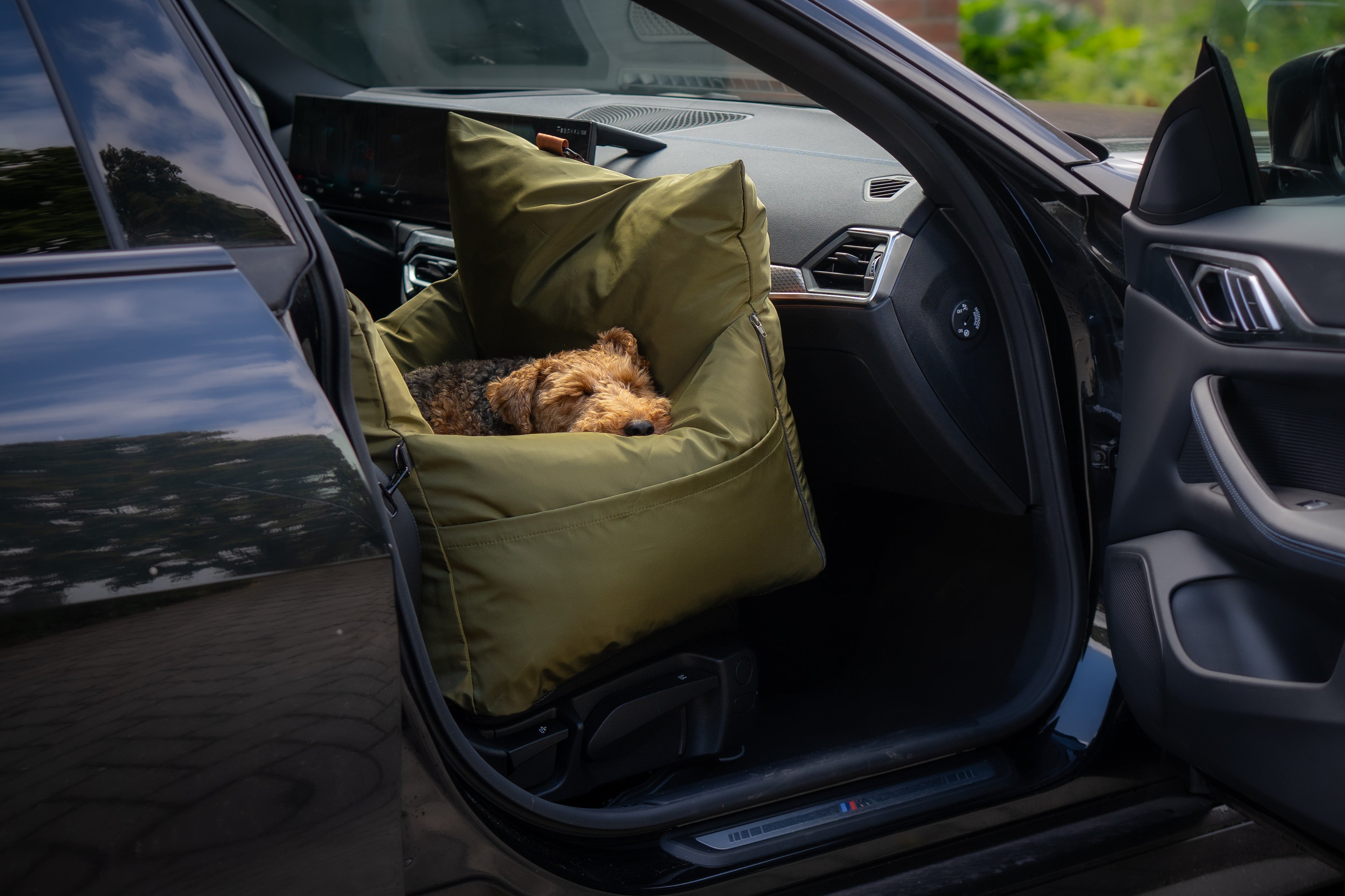 A calmer, safer way to travel with your dog. The all-in-one dog car seat and travel bed.